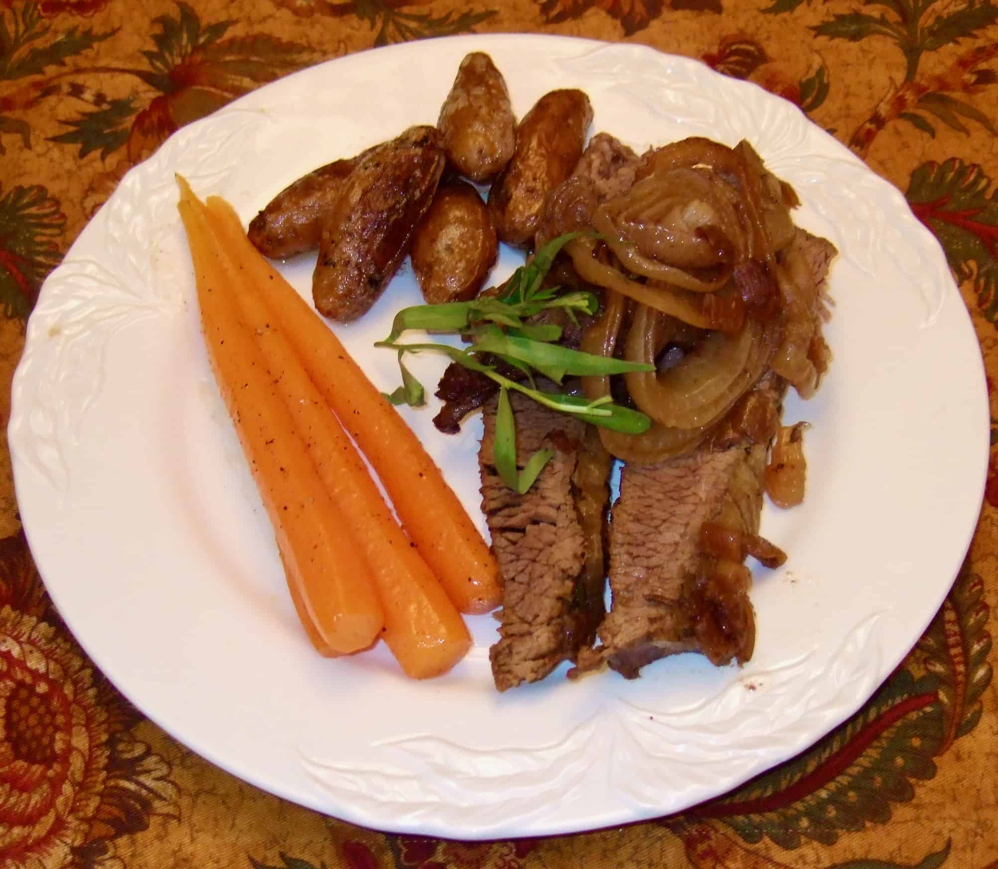 BRISKET OF BEEF WITH FINGERLING POTATOES AND MAPLE-GLAZED CARROTS